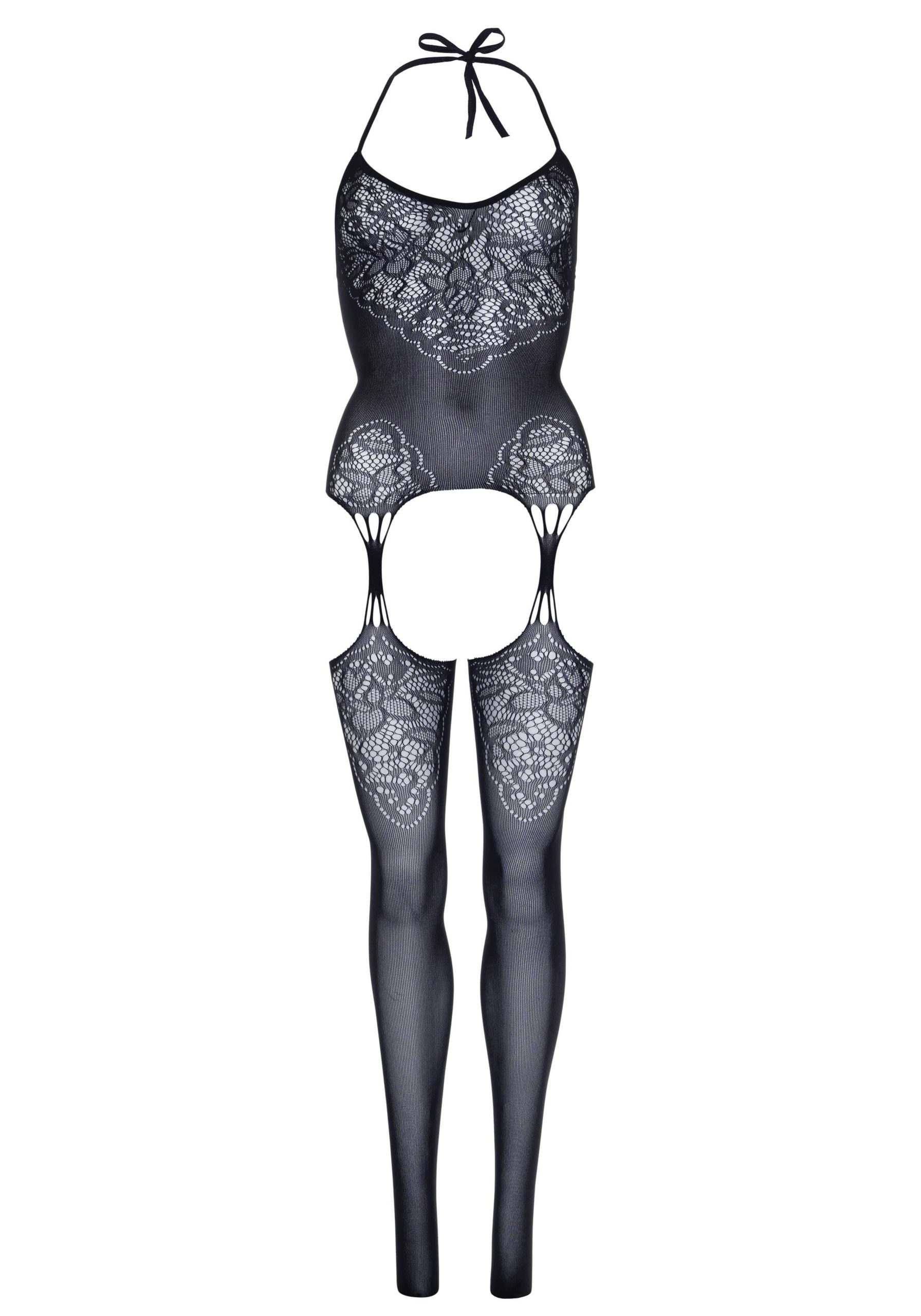 - Seamless lace jacquard net suspender halter bodystocking.